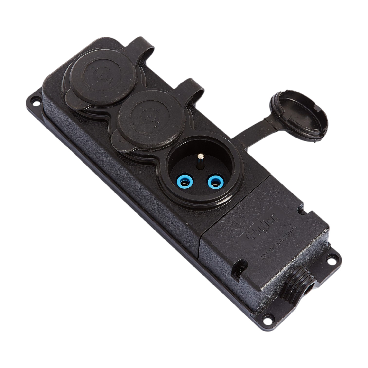 3x socket, French type E, triple “rubber” black socket with cover hermetic IP44 250V, 16A, 2P+Z, 3KMP-E, Bylion
