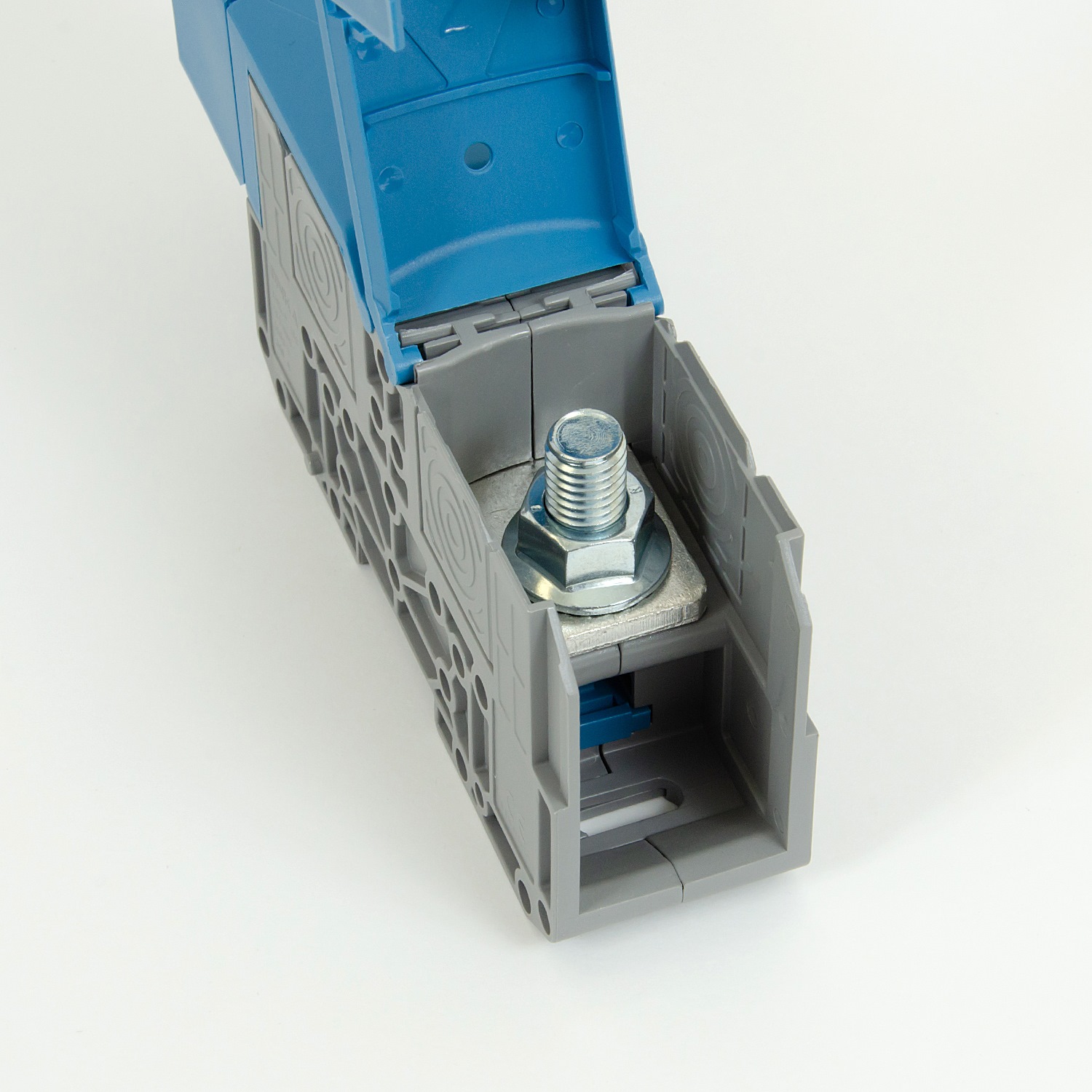 M12, 150mm2, conector de barra colectora roscado / borne de carril DIN con tapa protectora, azul, ONKA, made in Turkey