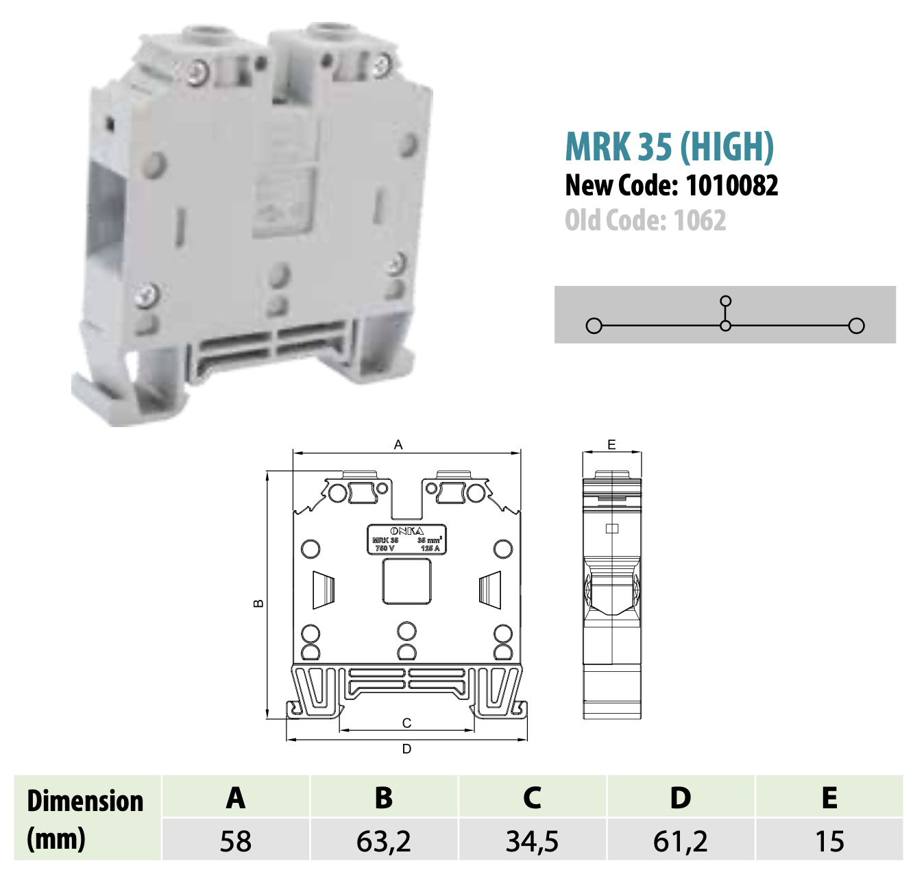 Conector roscado para barra colectora / borne para carril DIN 2 hilos gris, ONKA, made in Turkey