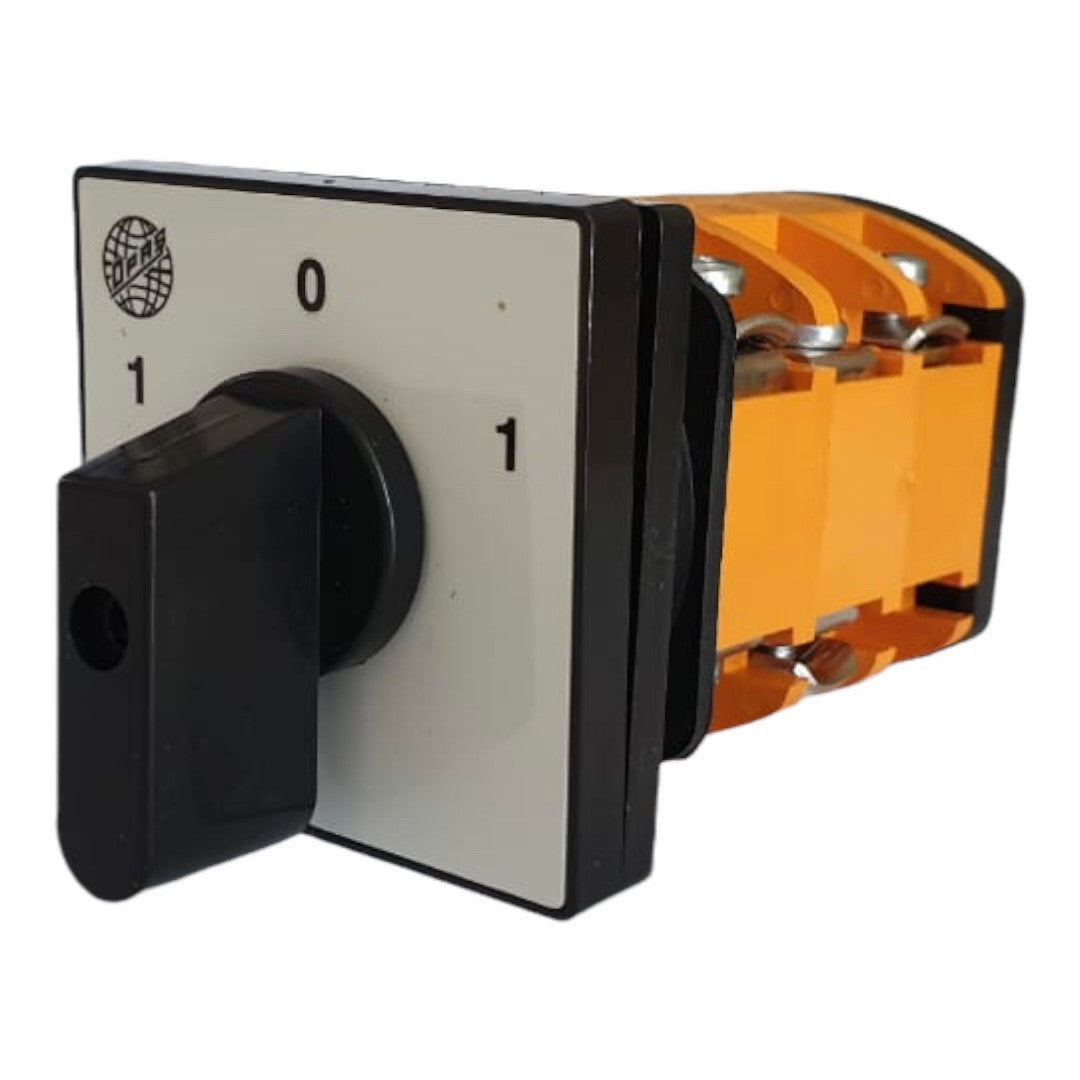 Interruptor rotativo de leva inversora diseñado para cambiar el sentido de giro de motores eléctricos.